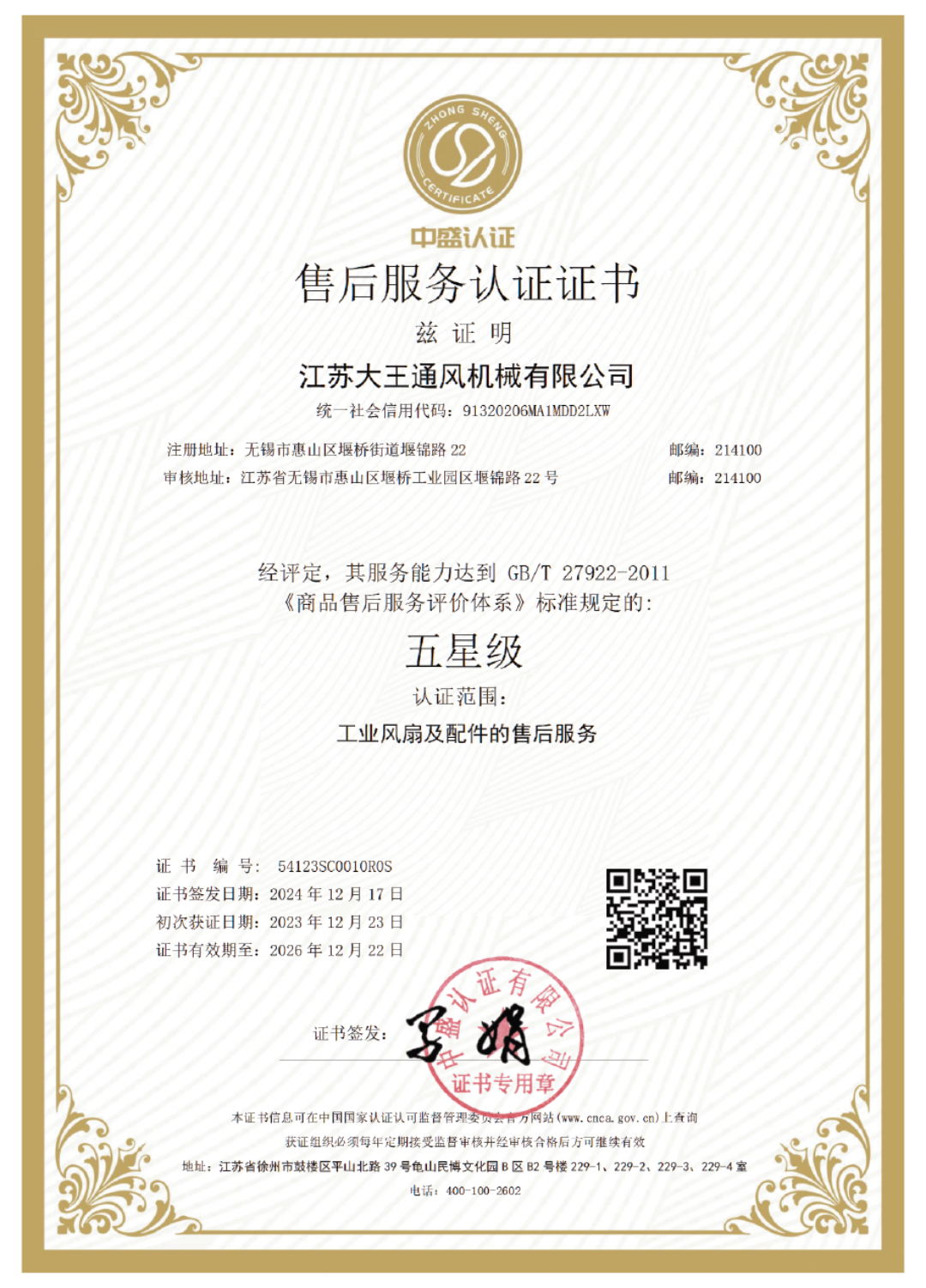 Service après-vente cinq étoiles Certification de qualification technique