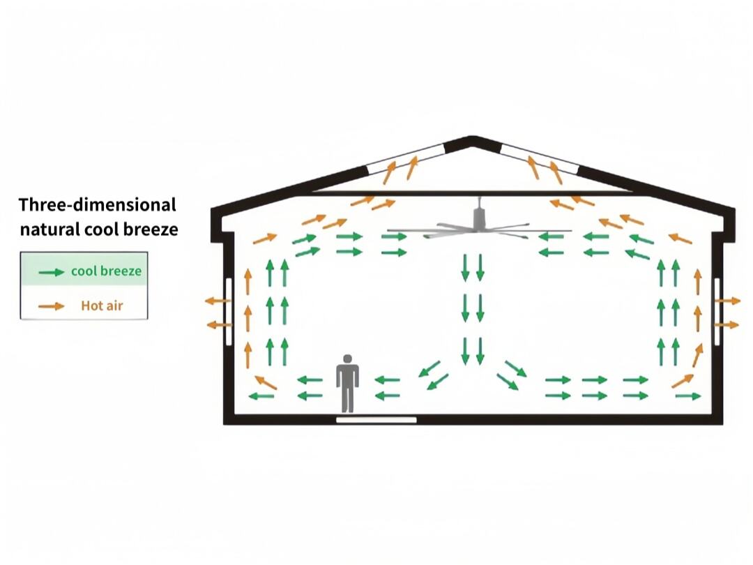 - → Lieux spacieux : les ventilateurs HVLS sont économes en énergie et rapides, avec des coûts d'utilisation à long terme plus faibles