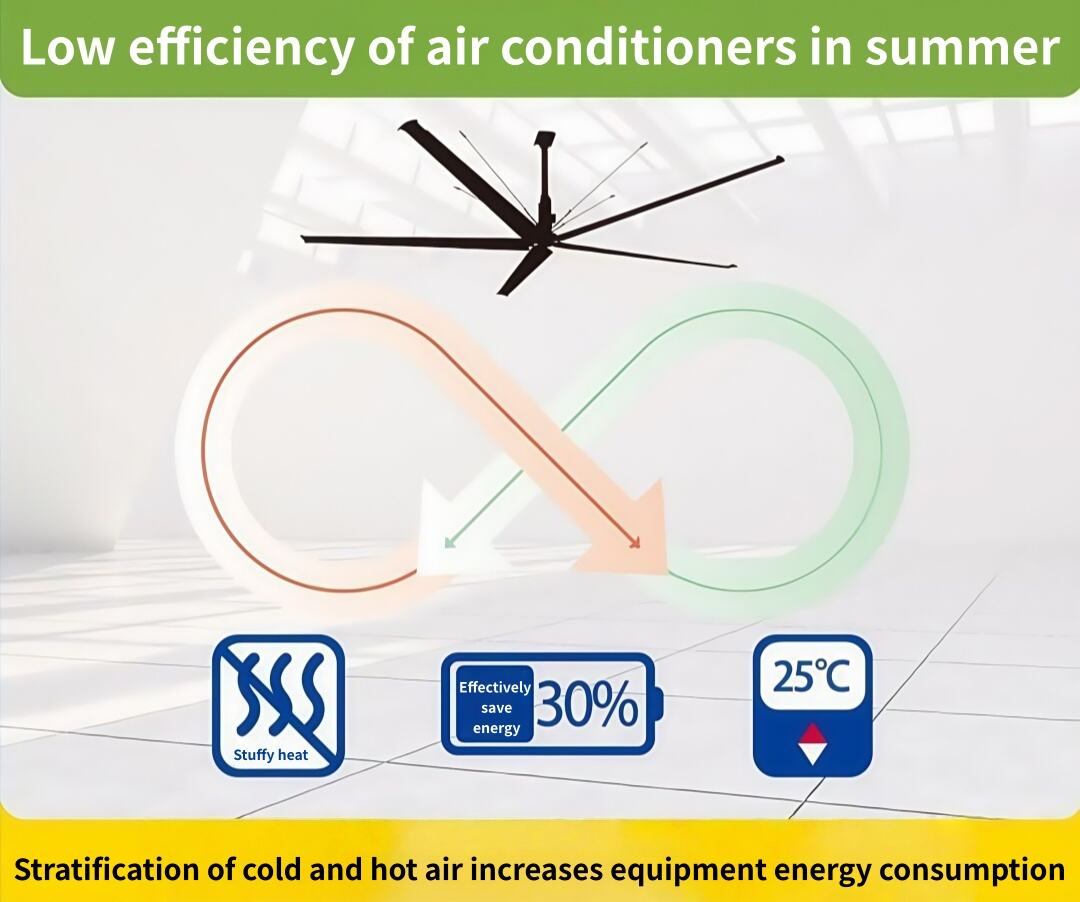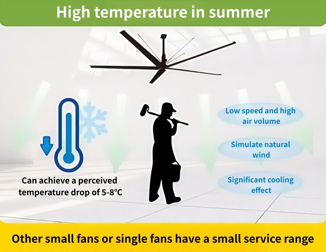 diameter 7,3-meter VlS Sebuah kipas HVLS tunggal dapat menjangkau area lebih dari 2000㎡ secara kontinu mengaduk udara membentuk sirkulasi tiga dimensi